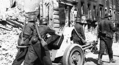 Żołnierze niemieccy transportują armaty PAK ulicą Żabią w okolicach placu Żelaznej Bramy. W tle widać zburzoną kamienicę przy Żabiej 3Foto: Leher/Bundesarchiv/Wikipedia
